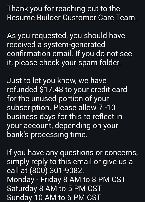To avoid any misunderstanding, this information is provided before, during, and after the subscription is bought. We also provide these details in the welcoming email sent after the purchase. We understand this information may be overlooked and recognize the importance of clarity at all stages of the customer experience. If you have any further questions or concerns, please don't hesitate to reach out to our support team at communications@resumebuilder.com. We're here to help.